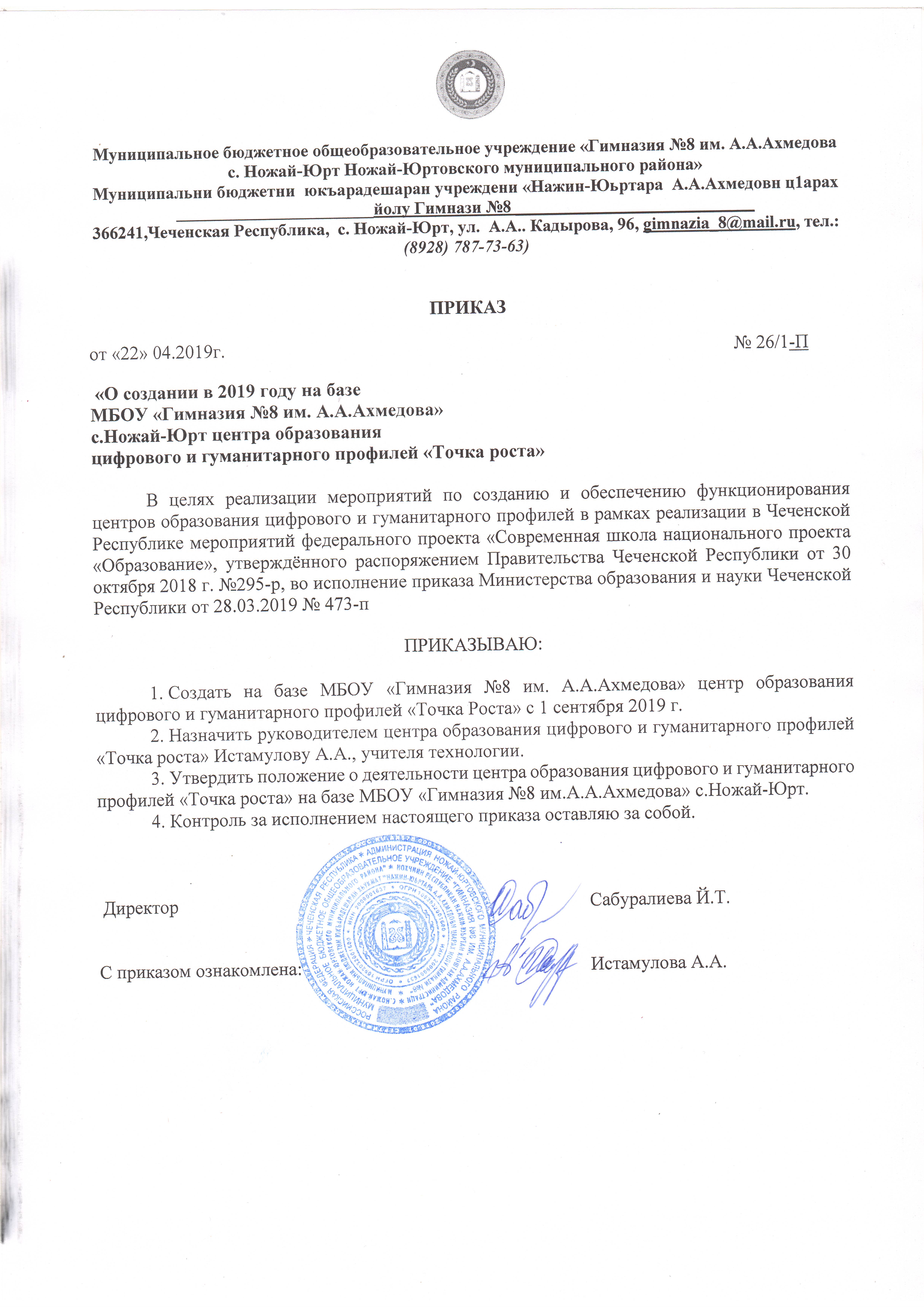 Приказ № 26/1-п от 22.04.2019г. "О создании в 2019г. на базе МБОУ "Гимназия №8 им. А.А.Ахмедова" с.Ножай-Юрт центра образования цифрового и гуманитарного профилей "Точка роста""