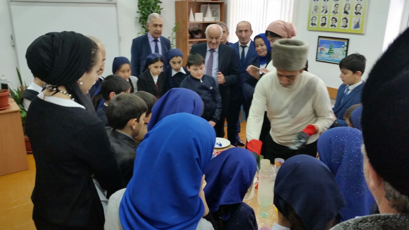 В соответствии с планом взаимодействия и совместной работы с учреждениями дошкольного образования были приглашены на урок воспитанники детских садиков «Седа», «Ангелочки», которые с восхищением следили за работой мастеров. На их глазах рождались замечательные произведения искусства без использования кисточек и других подручных средств. Были также приглашены учащиеся школ райцентра с Ножай-Юрт - СОШ № 2,3,4.
