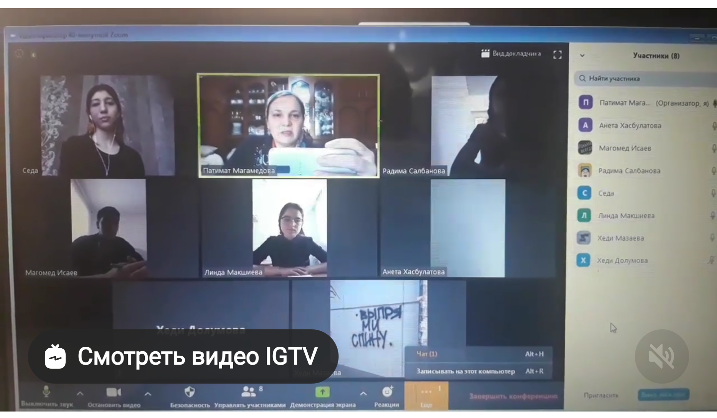 В МБОУ "Гимназия №8 им. А.А.Ахмедова" с.Ножай-Юрт продолжается дистанционное обучение. Урок математики в 10 классе провела учитель математики Магамедова П.М. на учебной платформе zoom.
