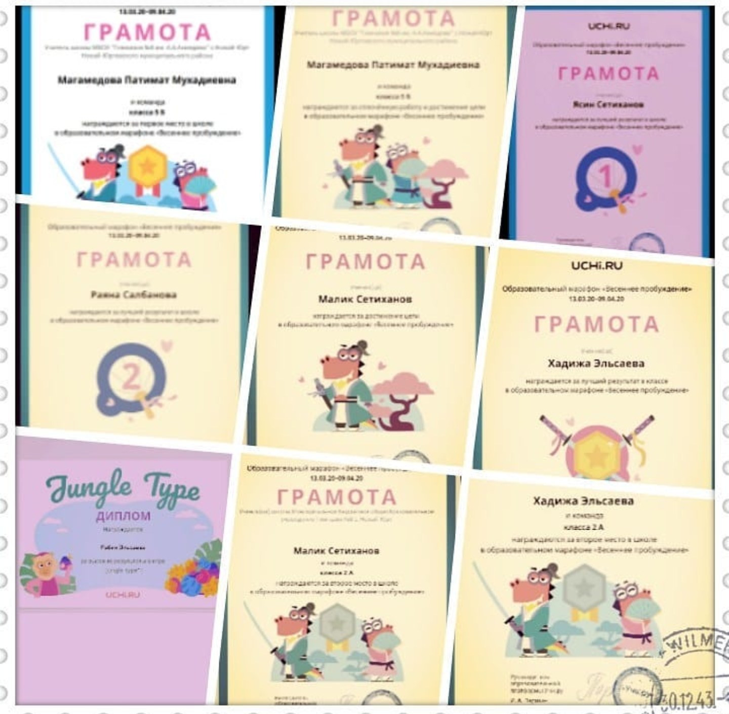 12.04.2020Ребятам из МБОУ "Гимназия №8 им. А.А.Ахмедова" с.Ножай-Юрт скучать на дистанционном обучении не приходится. В этом им помог марафон "Весеннее пробуждение" образовательной платформы Учи.ру. Ребята в очередной раз доказали, что вместе мы сила и дружная команда.
