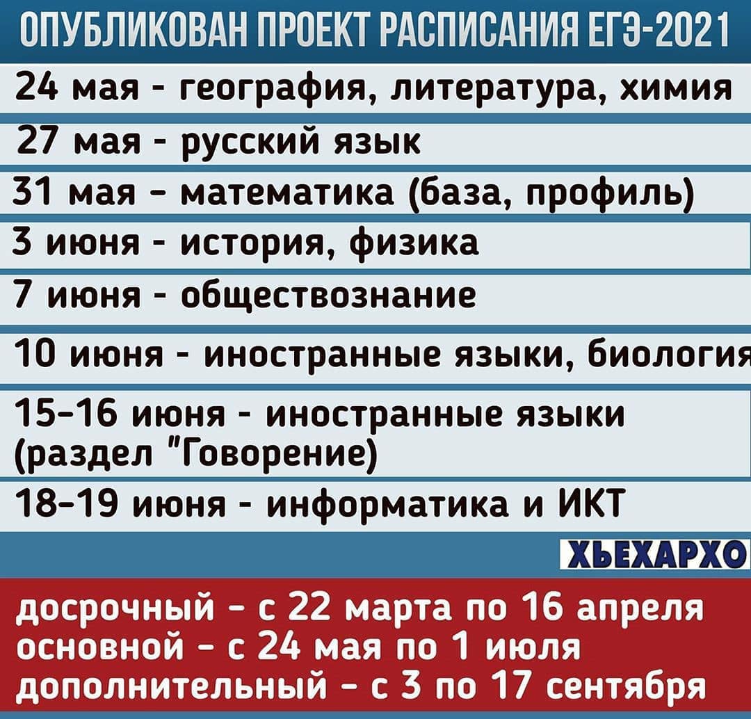 12.10.2020Министерство просвещения опубликовало проект расписания ЕГЭ на 2021 год. По планам, экзамен для выпускников 11-х классов пройдет в три этапа: досрочный - с 22 марта по 16 апреля, основной - с 24 мая по 1 июля, и дополнительный - с 3 по 17 сентября.Основные дни основного этапа:24 мая (понедельник) - география, литература, химия;27 мая (четверг) - русский язык;31 мая (понедельник) - ЕГЭ по математике базового уровня, ЕГЭ по математике профильного уровня;3 июня (четверг) - история, физика;7 июня (понедельник) - обществознание;10 июня (четверг) - иностранные языки (английский, французский, немецкий, испанский, китайский) (за исключением раздела "Говорение"), биология;15 июня (вторник) - иностранные языки (английский, французский, немецкий, испанский, китайский) (раздел "Говорение");16 июня (среда) - иностранные языки (английский, французский, немецкий, испанский, китайский) (раздел "Говорение");18 июня (пятница) - информатика и информационно-коммуникационные технологии (ИКТ);19 июня (суббота) - информатика и информационно-коммуникационные технологии (ИКТ).#МОН95 #Минпросвещения #проект #расписание #ЕГЭ #ЕГЭ2021 #газетаХьехархо