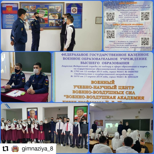 13.01.2021#Repost @gimnaziya_8• • • • • •В целях профориентационной работы с учащимися, 13.01.2021 года в МБОУ «Гимназия №8 им.А.А.Ахмедова» прошла встреча старшеклассников с выпускником нашей гимназии ныне курсантом Военно-воздушной Академии им. профессораН. Е. Жуковского и Ю. А. Гагарина г. Воронеж, Ахматхановым А.Д-М. и выпускником "СОШ с.Чурч-Ирзу им.М.С.Гадаева" Найбархановым Т.Р. В своей беседе они отметили, что Академия - это гордость не только города Воронежа, это гордость вооруженых сил страны. Один из самых больших военных вузов страны. Его закончили Ю.Гагарин, В.Терешкова, многие другие космонавты.В Военно-воздушной академии осуществляется обучение офицеров-слушателей оперативно-тактического уровня подготовки (магистратура), а также курсантов — будущих офицеров (специалитет). В 2013 году на базе Военно-воздушной академии создана первая в Вооруженных Силах Российской Федерации научная рота.Образовательную деятельность в составе академии ведут 25 факультетов, 115 кафедр, размещенные в Воронеже и в филиалах (Челябинск и Сызрань), учебно-авиационные базы по родам авиации, научно-исследовательские центры и другие структурные подразделения.В академии функционируют докторантура и адъюнктура очной формы обучения. Для защиты кандидатских и докторских диссертаций действуют шесть диссертационных советов по 14 научным специальностям. Также осуществляется целевая подготовка адъюнктов иностранных государств.Научный потенциал составляют авторитетные учёные — заслуженные деятели науки и работники высшего образования, возглавляющие 23 научные и научно-педагогические школы. Среди них 121 доктор наук и профессор, 793 кандидата наук, 401 доцент и старший научный сотрудник.