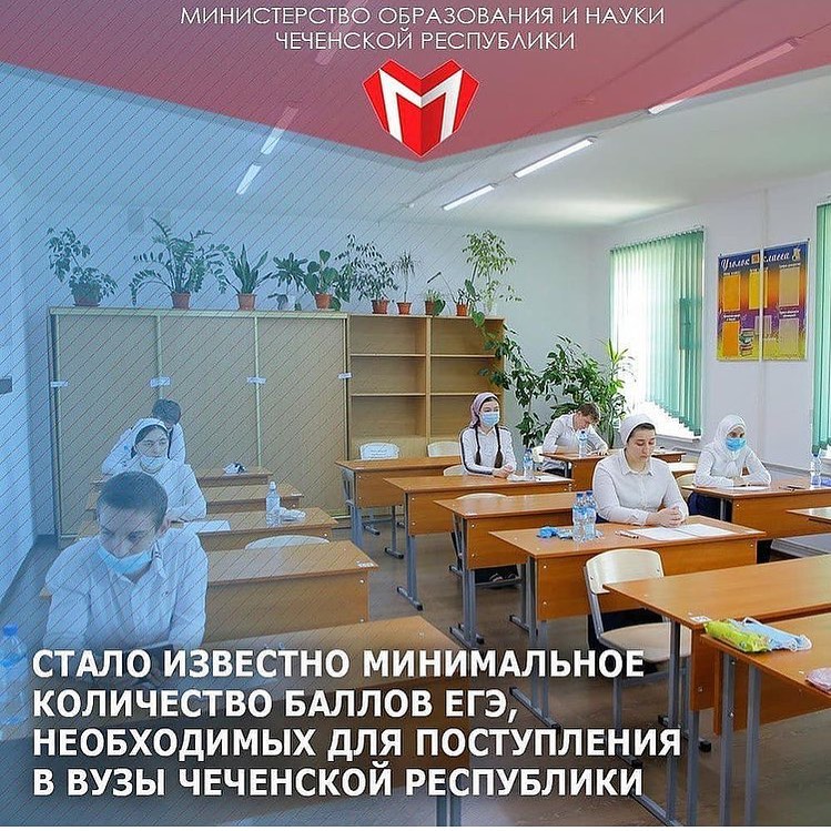 01.02.2021Дорогие друзья!Представляем вашему вниманию минимальное количество баллов единого государственного экзамена (ЕГЭ) по общеобразовательным предметам, соответствующим специальности или направлению подготовки, по которым проводится прием на обучение в образовательных организациях высшего образования Чеченской Республики на 2021/22 учебный год.Чеченский государственный университет:Русский язык - 40 баллов;Математика - 39 баллов;Физика - 39 баллов;Обществознание - 45 баллов;История - 35 баллов;Информатика и ИКТ - 44 балла;Иностранный язык - 30 баллов.Литература - 40 баллов;Биология - 39 баллов;География - 40 баллов.Химия - 39 баллов;Чеченский государственный педагогический университет:Русский язык - 40 баллов;Математика - 39 баллов;Физика - 40 баллов;Обществознание - 44 балла;История - 40 баллов;Информатика и ИКТ - 42 балла;Литература - 40 баллов;Биология - 40 баллов;Химия - 40 баллов;Грозненский государственный нефтяной технический университетим.ак. М.Д. Миллионщикова:Русский язык - 40 баллов;Математика - 39 баллов;Физика - 39 баллов;Информатика и ИКТ - 44 балла;Химия - 39 баллов;История - 35 баллов;Обществознание - 45 баллов;География – 40 баллов.