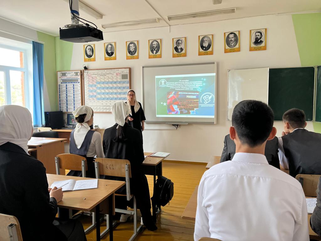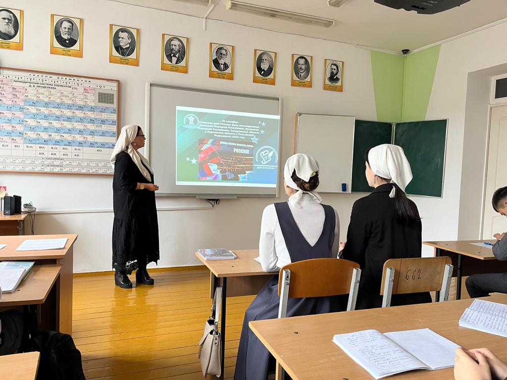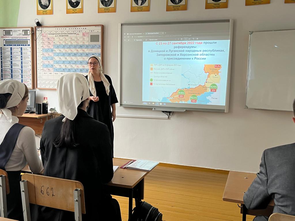 10.10.2023В МБОУ "Гимназия №8 им.А.А.Ахмедова с.Ножай-Юрт" при взаимодействии с отделом в Ножай-Юртовском районе УФСБ России по Чеченской Республике, учитель Истории и обществознания Эдиева М.У. провела классный час с обучающимися 10 класса посвящённый событию "30 сентября-День воссоединения ДНР, ЛНР, Запорожской области и Херсонской области с Российской Федерации"