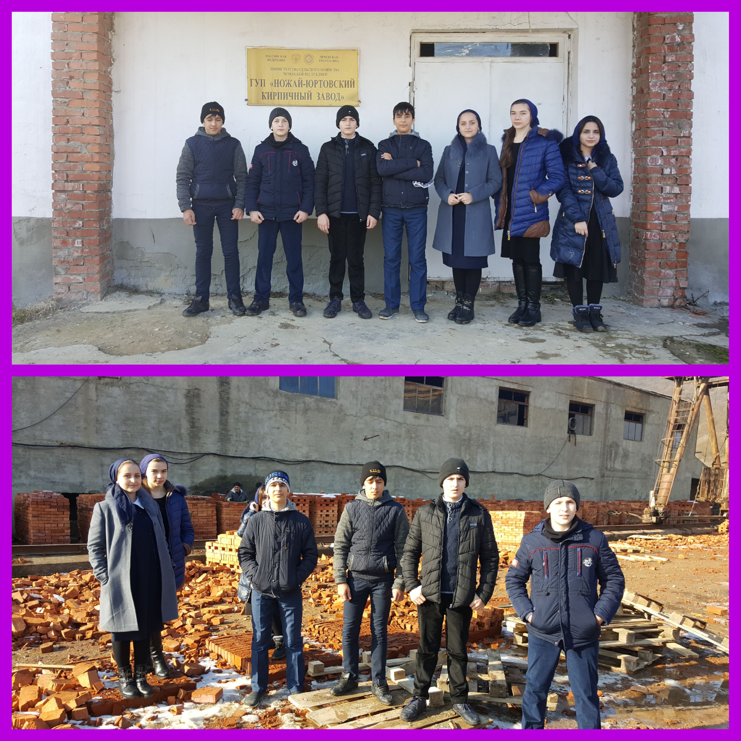 10 класса МБОУ «Гимназия №8 с. Ножай-Юрт» под руководством З.Т. Ахматхановой посетили ГУП «Ножай-Юртовский кирпичный завод» с. Ножай-Юрт. В ходе экскурсии учащиеся узнали, что основным видом деятельности завода является производство кирпича, черепицы и прочих строительных изделий из обожженной глины и ежесуточно выпускается до 24 тыс. шт. кирпичей.