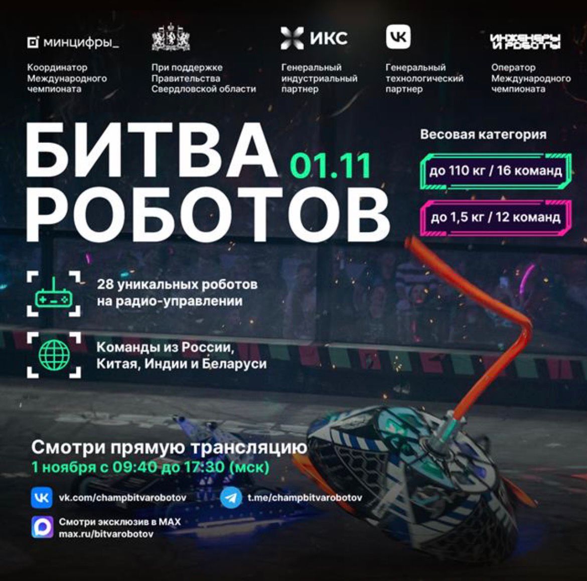 Битва роботов — международный чемпионат, в котором роботы сражаются в захватывающих поединках. Цель Чемпионата – популяризация в Российской Федерации инженерной мысли как драйвера развития и поддержки современных цифровых технологий.