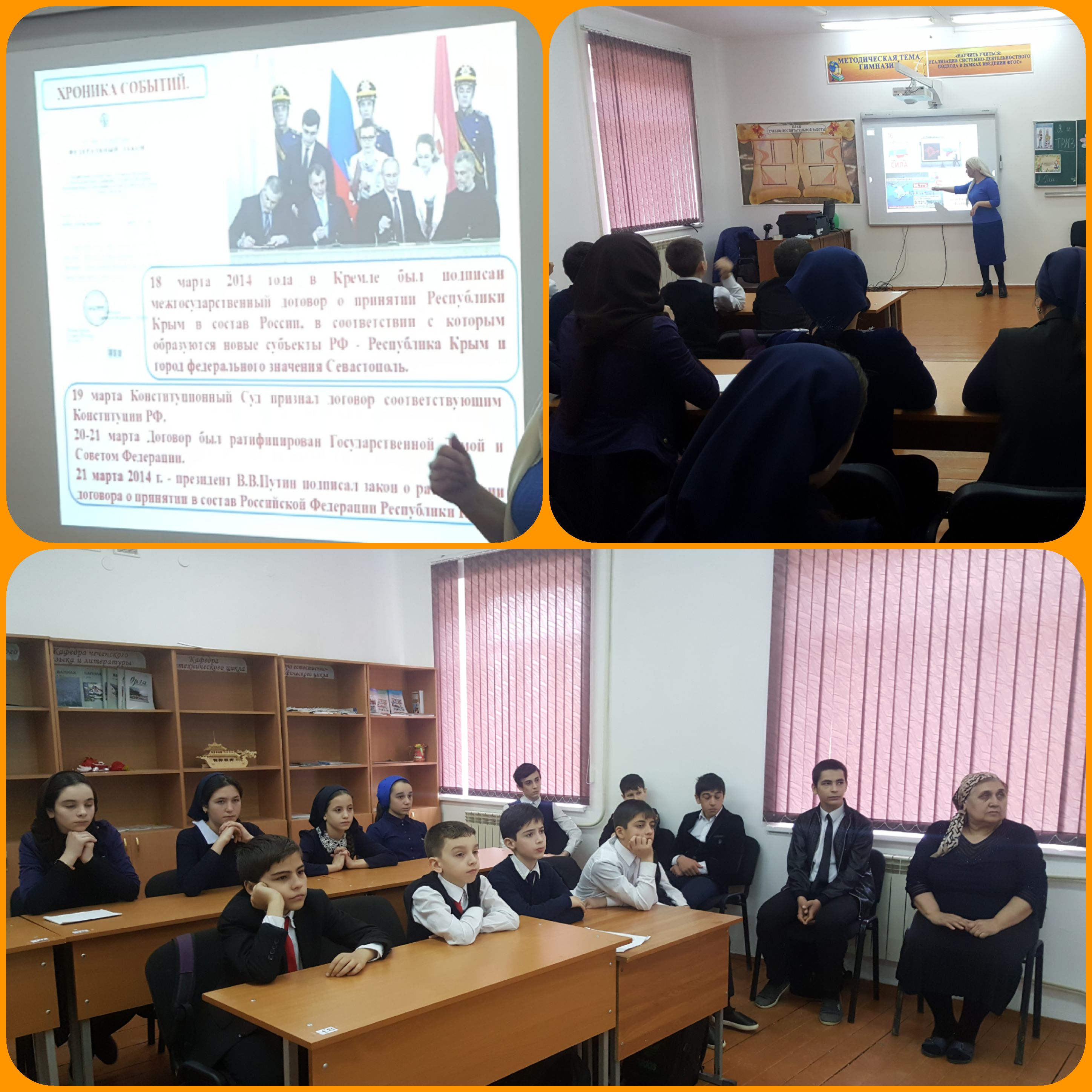 17 марта в рамках празднования годовщины вхождения в состав Российской Федерации Республики Крым и города Севастополя в В МБОУ Гимназия №8 с. Ножай-Юрт» проведены классные часы на тему: