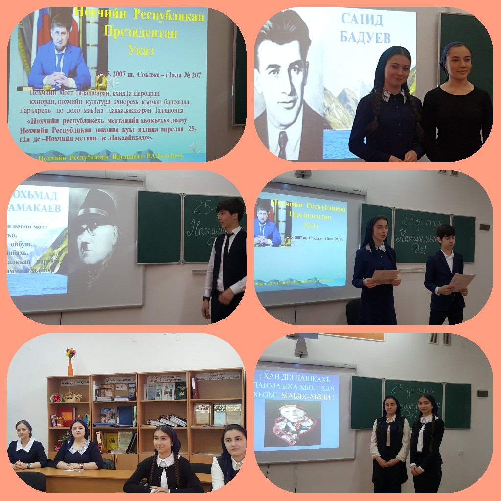Тахана, 20-чу апрелехь, 10-чу классехь д1адаьхьира НОХЧИЙН МАТТАНА лерина "Ларбе нохчийн мотт, хазбе и" ц1е йолу кл.сахьт. Вайн къоман дахарехь даздеш долчу денойх уггар деза дерг а, вайн къоман уггар сийлахьчу денойх дерг а, соьга хаьттича, Нохчийн меттан де ду. Иза даздо вай х1ора шарахь 25-чу апрелехь. Стеган къам къастош берг буьйцуш болу мотт бу. Мотт - вайн ойланан а, кхетаман а, хьекъалан а, дахаран а ца хилча йиш йоцу г1ирс бу. Нохчийн мотт- вайн къоман а, х1ора нохчийчун а дахаран хазна ю.
