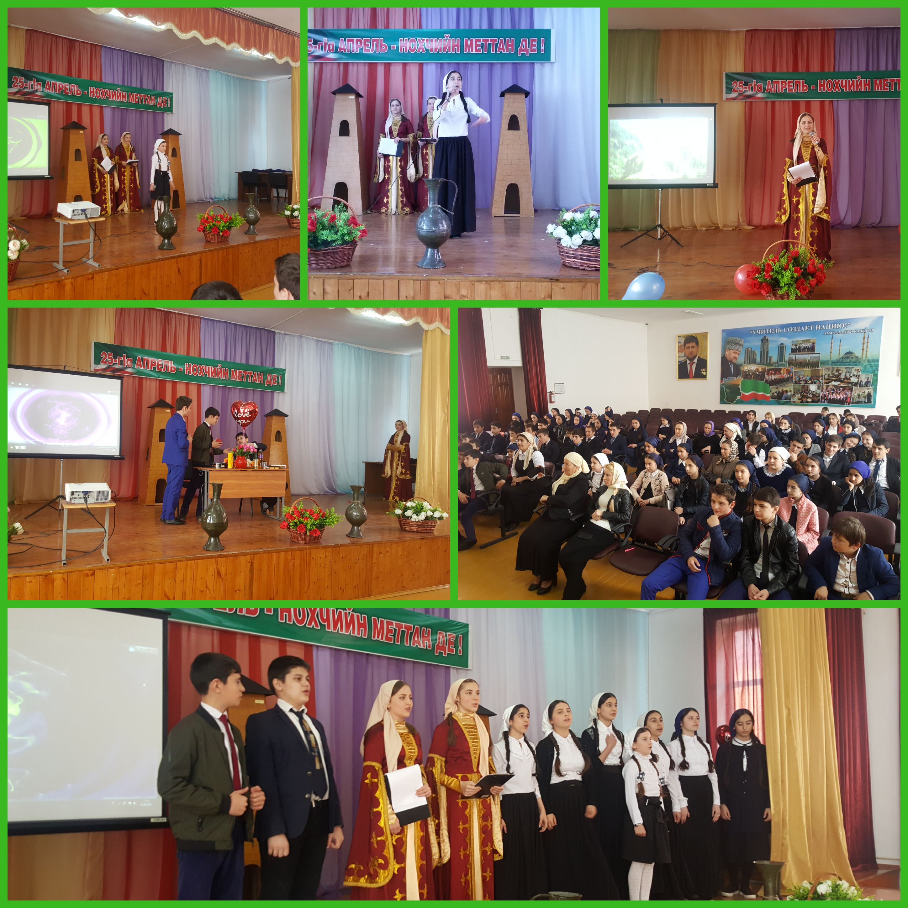 21.04.2018 года в рамках месячника, посвященной Дню чеченского языка, в целях духовно-нравственного воспитания подрастающего поколения, а также в целях воспитания чувства восхищения красотой родного края, воспитания чувства гордости за свой край, родной язык в МБОУ «Гимназия №8 с.Ножай-Юрт» прошло торжественное мероприятие «Хьомсара нохчийн мотт, хьо бахалахь!».