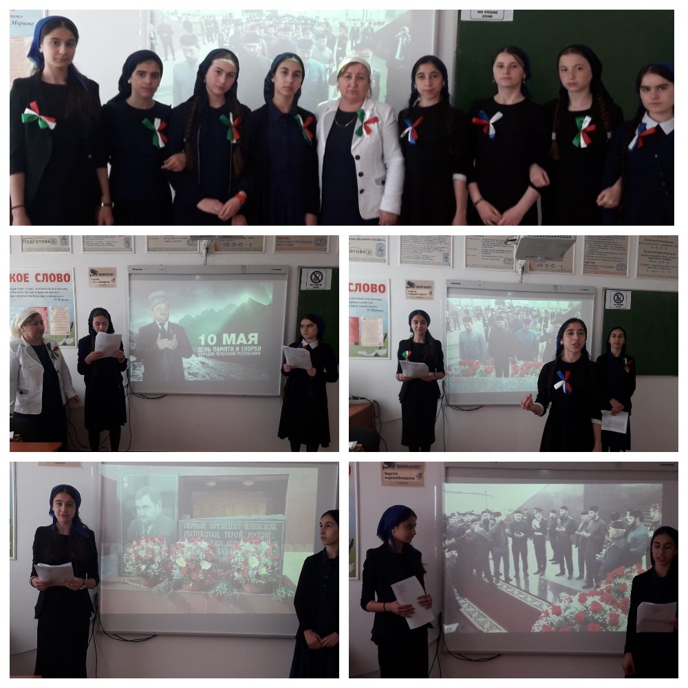 В истории чеченского народа много трагических дней. В апреле 2011года Главой ЧР Рамзаном Кадыровым был подписан Указ об установлении 10 мая Днём памяти и скорби народов ЧР.В этот день вспоминают трагические события в истории чеченского народа-это сталинская депортация 23 февраля 1944 года, сожжённые жители селения Хайбах,сотни тысяч мирных жителей, погибшие в первую и вторую военные кампании на территории нашей республики, трагическая гибель 9 мая 2004 года Первого Президента ЧР Ахмат-Хаджи Кадырова. Классным руководителем была проведена беседа о Первом Президенте А-Х Кадырове, который принёс мир и спокойствие на чеченскую землю. Не жалея себя, ценой своей жизни Ахмат-Хаджи спас наш народ, помог выбраться из бездны. Сегодня наша республика процветает и ,конечно, в этом его заслуга.