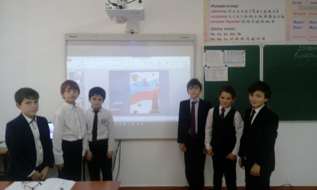26 октября классным руководителем 4а класса Нурмухаммедовой Р.Р. был проведен классный час, посвященный Дню народного единства. Дети узнали об истории этого праздника, о победе над польскими захватчиками в 1612г. Цель этого классного часа- показать, что только в единстве сила Российского народа.