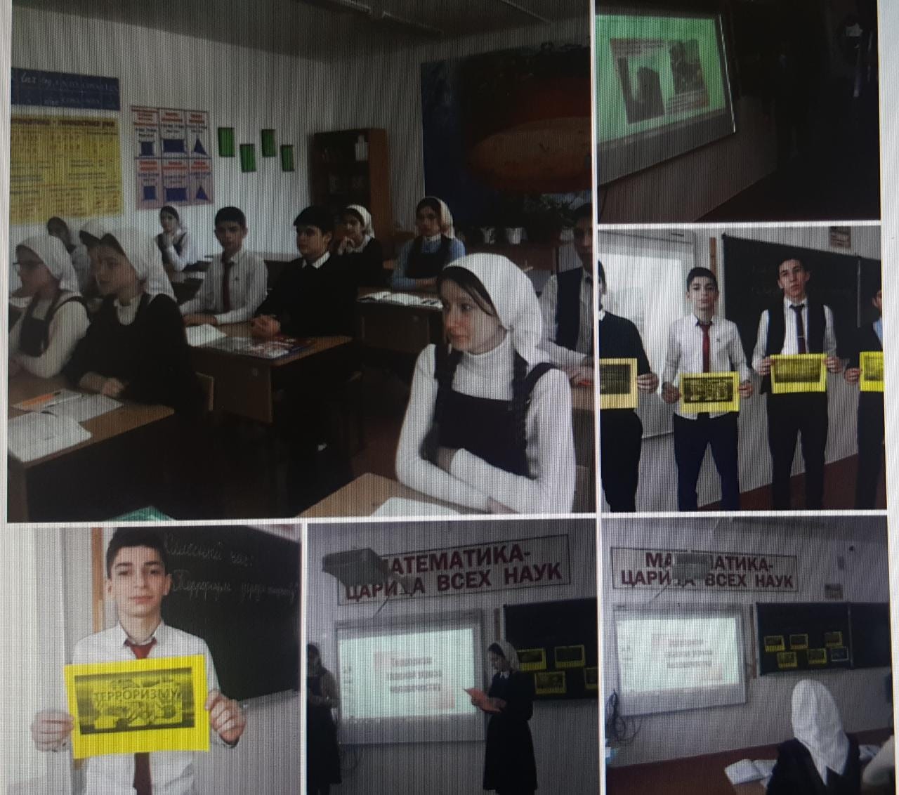 20.02.2019г.в 9б классе кл.рук. Магамедова П.М. провела классный час «Терроризм- угроза обществу». Целью классного часа было объяснить сущности терроризма, его типы и цели, основ безопасности в ЧС, формирование общественного сознания и гражданской позции подрастающего поколения.
